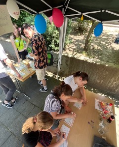 Im Rahmen einer generationsübergreifenden Aktion kamen Kinder und Jugendliche mit Seniorinnen (indirekt) ins Gespräch. Die Aktion fand in der Offenen Tür sowie beim Sommerfest am Demokratiestand statt. Auf Postkarten setzten sich die Teilnehmenden mit den Fragen auseinander, was Demokratie für sie bedeutet, wie sie im Alltag gelebt wird und welche Wünsche sie an die jeweils andere Generation haben – von jung zu alt und umgekehrt. So entstand ein direkter Austausch über Erfahrungen, Erwartungen und Perspektiven auf demokratisches Zusammenleben.